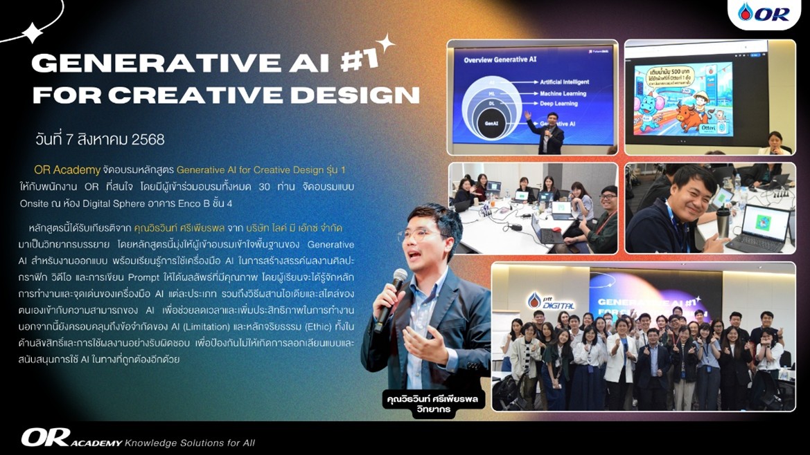 In 2025, OR organized an onsite Generative AI for Creative Design training program for OR employees who were interested in the topic, with 30 participants attending the course. The program focused on building a foundational understanding of Generative AI for design-related work, along with hands-on learning on the use of AI tools to create artwork, graphics, videos, and to develop effective prompts that deliver high-quality outputs. Participants gained insights into the working principles and key strengths of various AI tools, as well as how to integrate their own ideas and styles with AI capabilities to help reduce working time and enhance efficiency.
