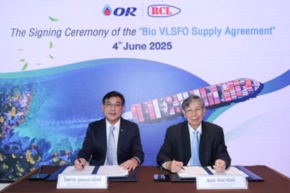OR, in collaboration with RCL Public Company Limited, signed an agreement to supply a new alternative fuel, “Bio Very Low Sulphur Fuel Oil (VLSFO),” for cargo vessels. This initiative represents Thailand’s first development of Biofuel utilization in the maritime transportation sector. The developed Biofuel is a blend of Very Low Sulphur Fuel Oil (VLSFO) and UCOME (Used Cooking Oil Methyl Ester), which is produced from used vegetable oil through a refining process.