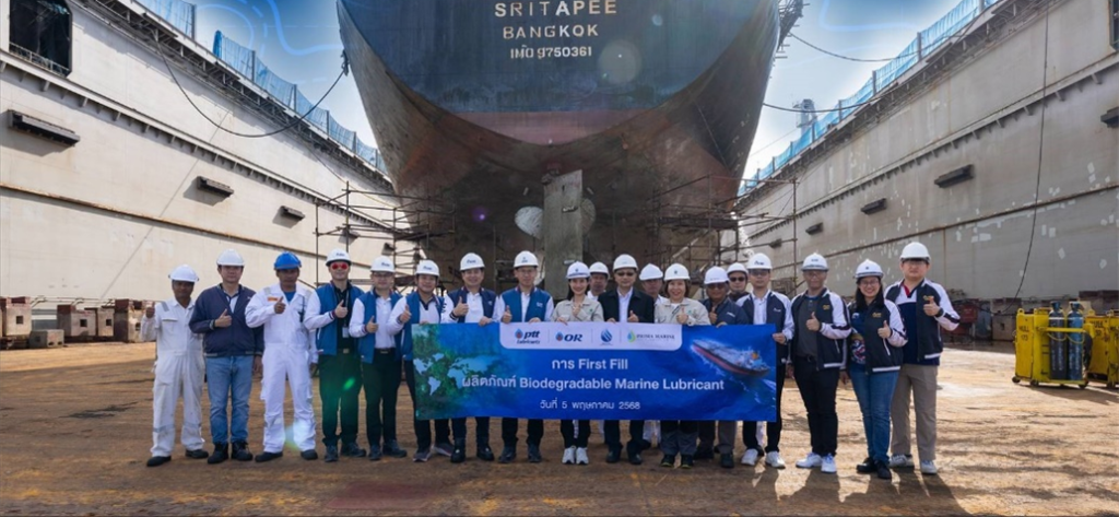 OR, SEAOIL, and PRIMA MARINE jointly launched the use of Biodegradable Marine Lubricants by conducting the first-ever filling of biodegradable lubricants in the stern tube system of the SRI TAPEE vessel during its maintenance at Unithai Shipyard, Chonburi Province. This collaboration represents the successful outcome of continuous joint research and development (R&D) efforts since 2024 to produce environmentally friendly marine lubricants with Environmentally Acceptable Lubricant (EAL) properties, which are naturally biodegradable and help reduce impacts on marine ecosystems.