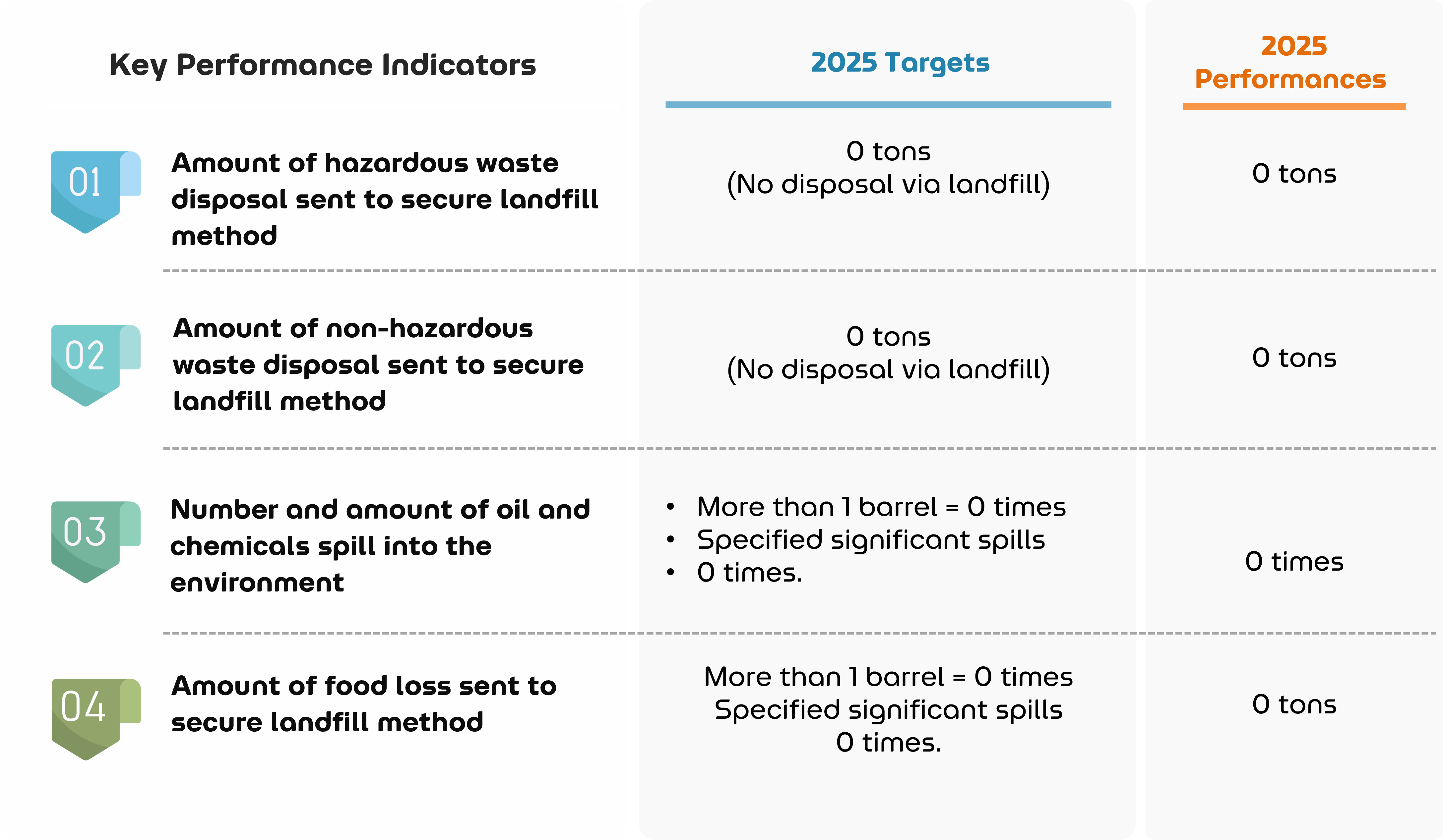 For non-recyclable waste, OR has measures to ensure that waste are properly disposed of by a licensed disposer as legally required. The licensing companies who collect waste from OR’s operation will clearly identify the reuse or recycling methods to ensure zero waste to landfill. The amount of waste diversion to landfill and the disposal methods will be then reported and verified by an independent accredited body via annual sustainability verification and assurance. In 2025, OR achieves the zero waste-to-secure-landfill target for both hazardous and non-hazardous waste.