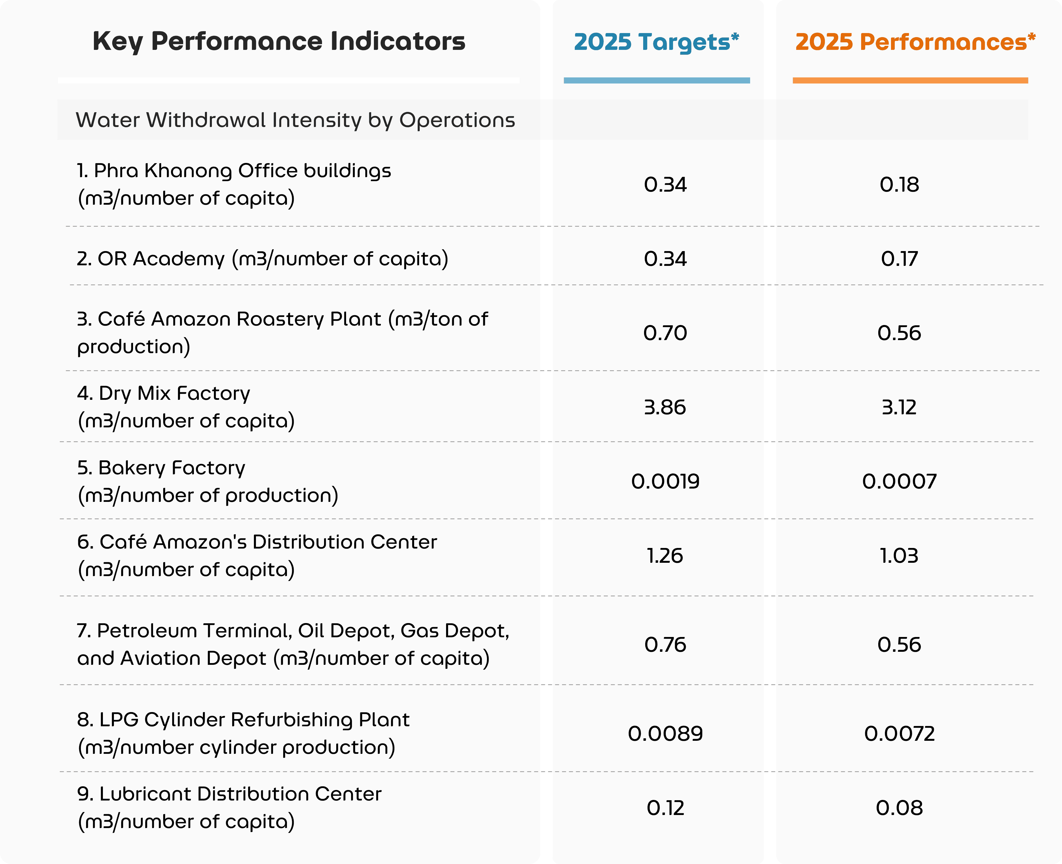 *OR sets water-related targets by considered following key factors, including assessing water use with internationally recognized tools to identify Water Stress Areas. It also reviews each facility’s activities and historical water consumption to establish area-specific water withdrawal control targets. These targets align with the company’s policy as well as national water management guidelines and relevant government regulations.