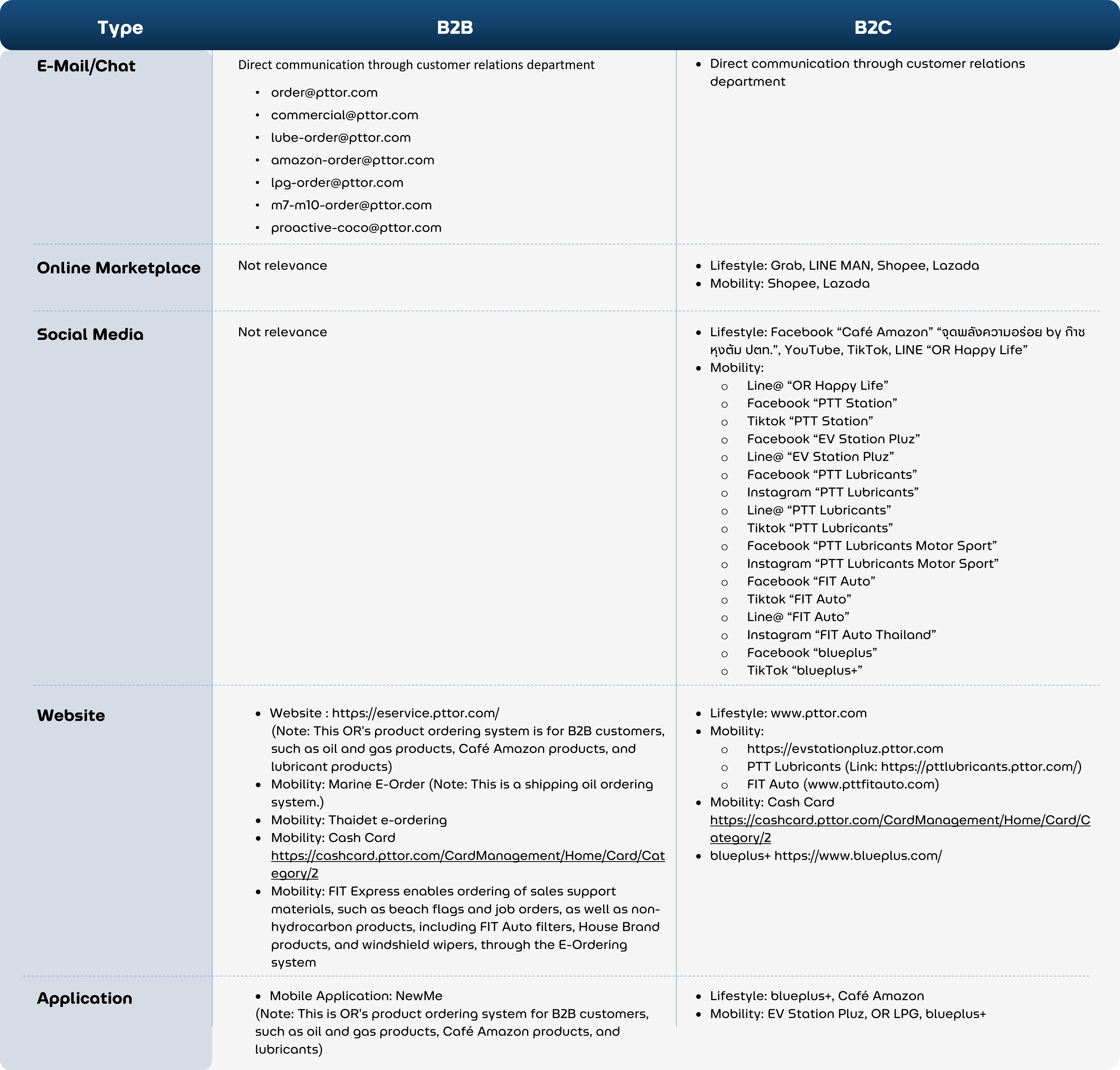 Business-to-Consumer: B2C OR’s individual customers, such as those using products and services provided by branded OR stores, namely, PTT Station, Cafe Amazon, LPG, PTT Lubricants, and FIT |