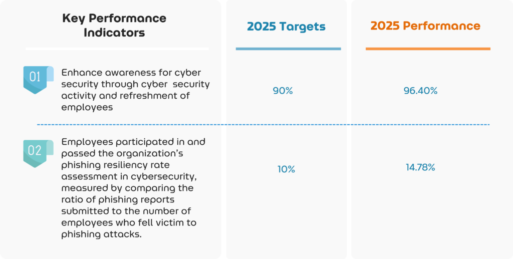 The E-learning training is designed to help employees understand digital service delivery, policies, regulations, practices, and standards related to the company’s information security. This also includes the understanding of laws related to the Computer-related Crime Act, threats, and consequences of misuse and improper use of information systems. Training content includes Password Security, Phishing Emails, Malware Protection, and Internet Using Security, presented through animation for improved engagement. A Refreshment Course (Cyber Security Awareness Exam) is administered to long‑serving employees. In 2025, 98.55% of participants passed the test.Contractor personnel working for OR are also required to take the Cyber Security Awareness test, with 100% passing in 2025.