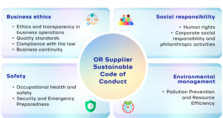 OR has established the OR Supplier Sustainable Code of Conduct (SSCoC) to specify the standards that OR’s suppliers should adhere to throughout their business operations. This includes ethical business practices, social responsibility, safety, and environmental management. OR communicates the details of the Supplier Sustainable Code of Conduct (SSCoC) to every supplier through electronic communication and integrating the Supplier Sustainable Code of Conduct as part of the annual supplier training.