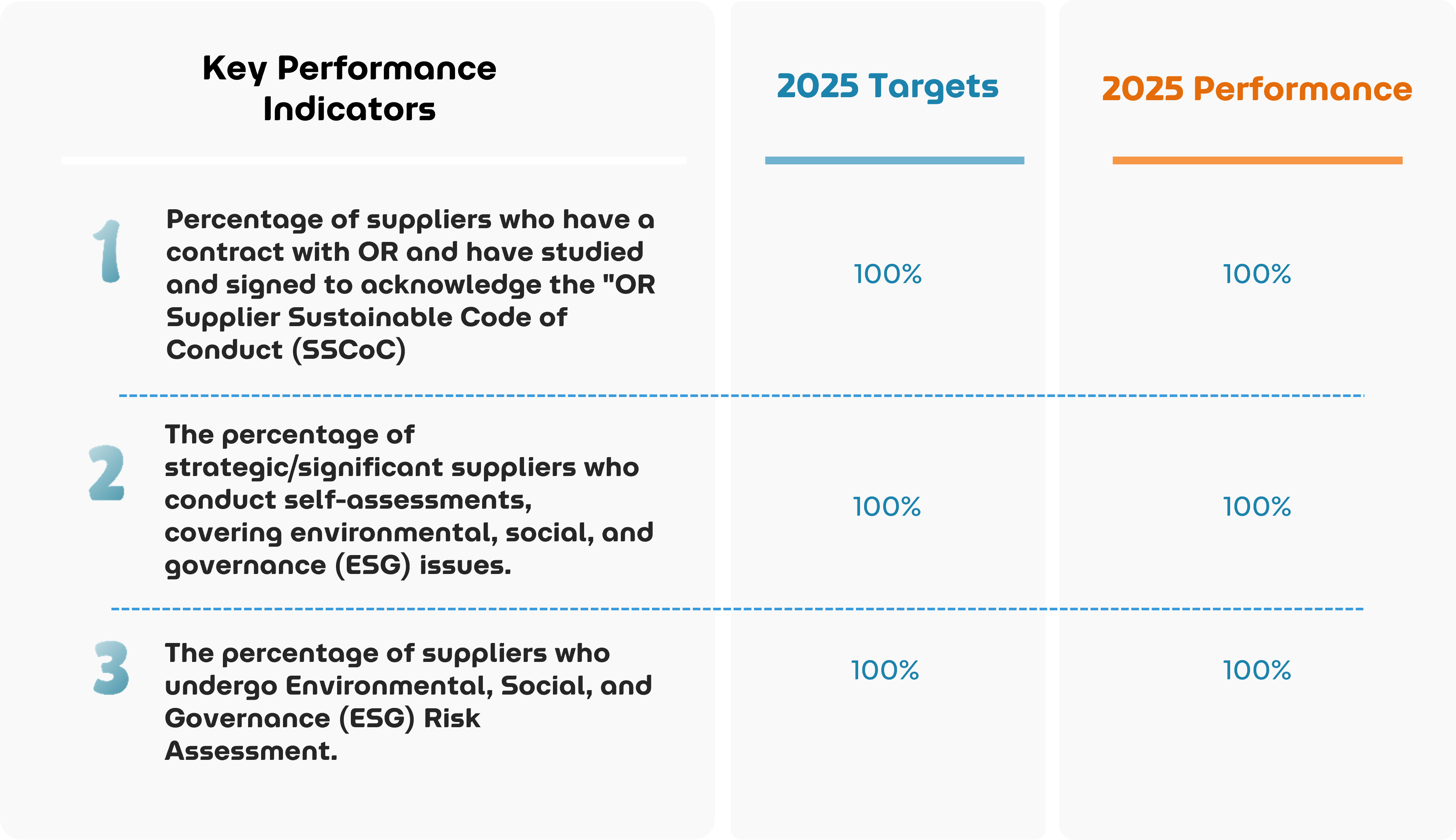 OR supplier ESG assessment is categorized into three criteria as follows: