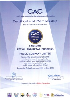 2. OR received the Excellent Corporate Governance (Excellence CG Scoring) for the 4th consecutive year from the Corporate Governance Report of Thai Listed Companies 2024 (CGR), which is based on consideration of 4 aspects: shareholders’ rights and equal treatment of shareholders, consideration of the role of stakeholders and sustainable business development, information disclosure and transparency, and the responsibility of the board of directors from the Thai Institute of Directors Association (IOD) and the Stock Exchange of Thailand (SET).