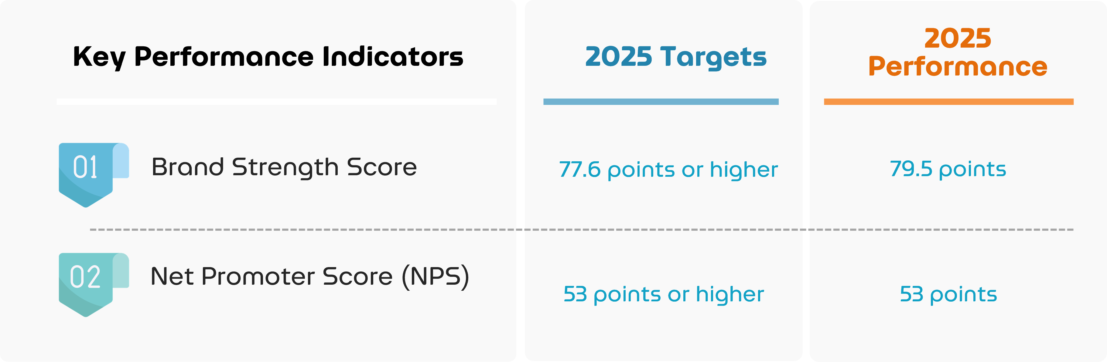The overall scores in all three dimensions were 1.9 points higher than the target set for 2024, which was 77.6 points. The Net Promoter Score (NPS) evaluation results, which is a tool for measuring customers’ willingness to recommend products and services, were 53 points, equal to the target set for 2024, which was 53 points.