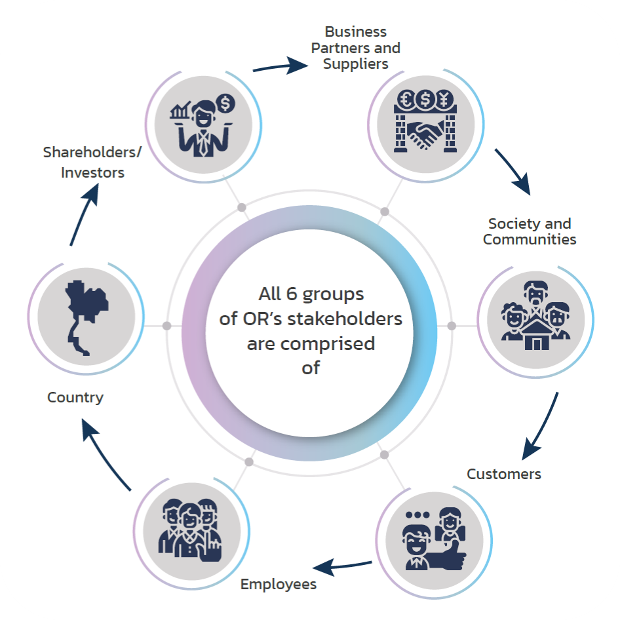 • Annual General Meeting of Shareholders. • Disclosure of information through the annual report • Disclosure of information through the Management Discussion and Analysis (MD&A) and quarterly Analyst Meetings. • Channels for receiving feedback, suggestions, and complaints through the Ordering & Customer Relations Contact Center 1365, and the company website • Direct communication through OR’s Investor Relations Department. | • Good corporate governance • Sustained business growth and attractive returns | • Compliance with good corporate governance policies • Communicating and disclosing business operation information to stakeholders • Publishing One Report (Form 56-1) and the sustainability report |