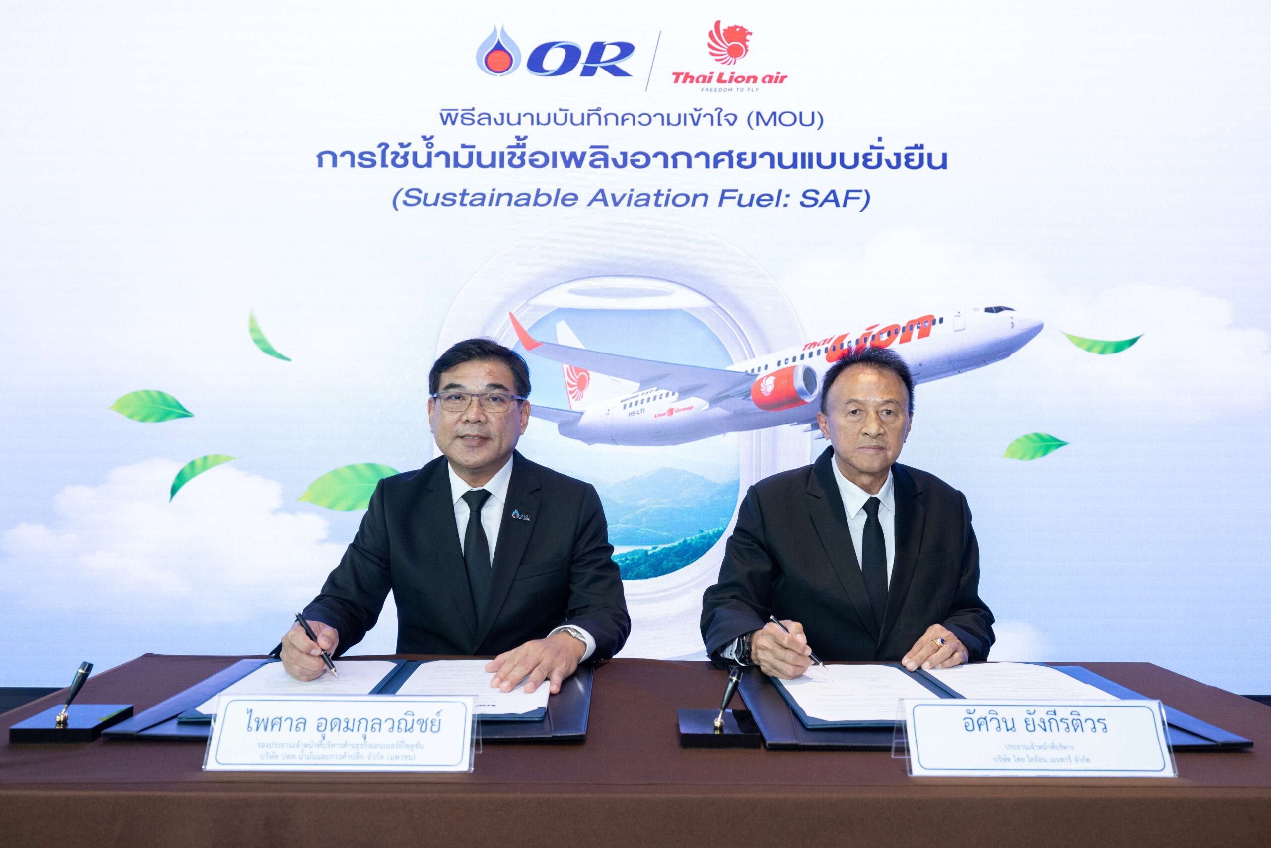นายไพศาล อุดมกุลวณิชย์ รองประธานเจ้าหน้าที่บริหารด้านธุรกิจเอนเนอร์ยี่โซลูชัน บริษัท ปตท. น้ำมันและการค้าปลีก จำกัด (มหาชน) หรือ OR และ นายอัศวิน ยังกีรติวร ประธานเจ้าหน้าที่บริหาร สายการบินไทย ไลอ้อน แอร์ ร่วมลงนามบันทึกความเข้าใจ (MOU) เพื่อเริ่มต้นใช้น้ำมันเชื้อเพลิงอากาศยานแบบยั่งยืน หรือ SAF (Sustainable Aviation Fuel) ในเส้นทางบินทั้งภายในประเทศและระหว่างประเทศ โดยมี นางนันทพร โกมลสิทธิ์เวช ผู้อำนวยการฝ่ายการพาณิชย์สายการบินไทย ไลอ้อน แอร์ พร้อมด้วยคณะผู้บริหาร OR ร่วมเป็นสักขีพยาน ณ ห้องประชุม OCRS ศูนย์เอนเนอร์ยี่คอมเพล็กซ์ อาคารบี ซึ่งถือเป็นอีกหนึ่งก้าวสำคัญของการขับเคลื่อนอุตสาหกรรมการบินไทยไปสู่ความยั่งยืน