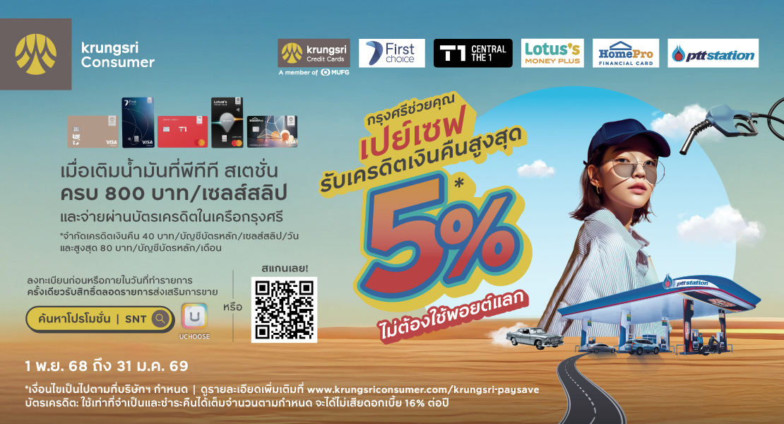 💳ลูกค้าบัตรเครดิตในเครือกรุงศรี รับเครดิตเงินคืน 5%* ณ สถานีบริการพีทีที สเตชั่นทั่วไทย