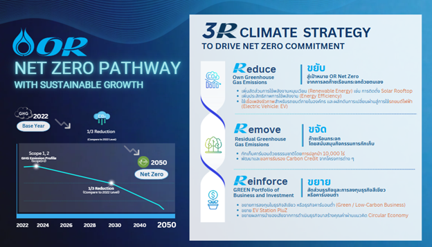 เพื่อมุ่งลดการปล่อยก๊าซเรือนกระจกจากการดำเนินธุรกิจของ OR ตามเป้าหมายการมุ่งสู่ความเป็นกลางคาร์บอน (Carbon Neutrality) ภายในปี 2573 และ การปล่อยคาร์บอนสุทธิเป็นศูนย์ (Net Zero Emissions) ภายในปี 2593 OR ได้พิจารณาตั้งเป้าหมายโดยอ้างอิงแนวทางตามหลักการกำหนดเป้าหมายทางวิทยาศาสตร์หรือ SBTi (Science Based Target initiative: SBTi) และกำหนดกลยุทธ์ตามหลัก 3Rs Climate Strategy ในการดำเนินงาน ได้แก่