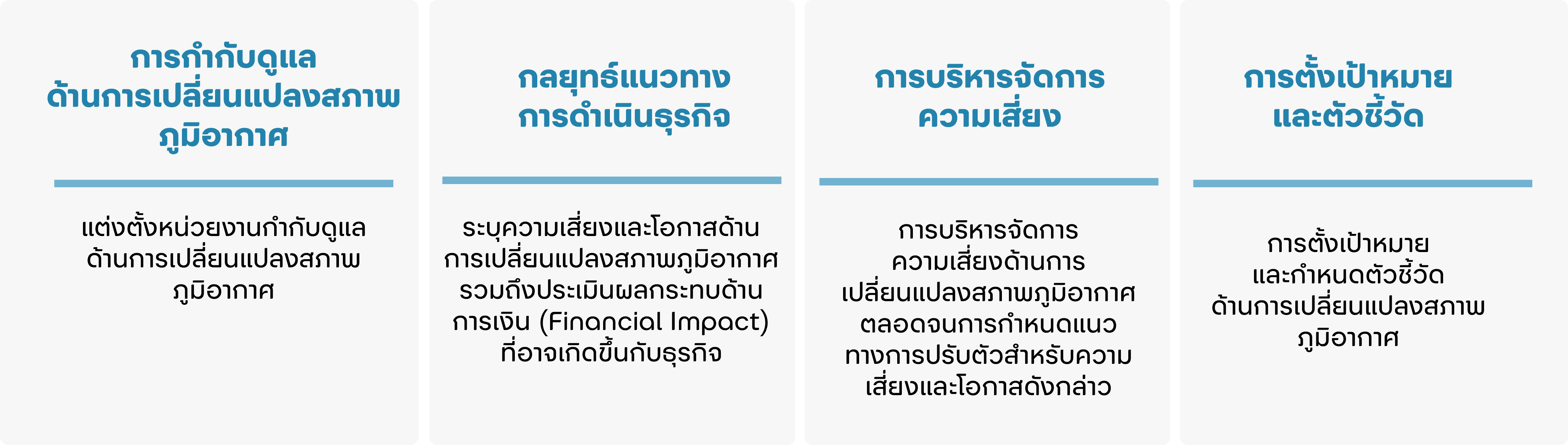ตั้งแต่การแต่งตั้งหน่วยงานกำกับดูแลด้านการเปลี่ยนแปลงสภาพภูมิอากาศ การกำหนดกลยุทธ์ในการดำเนินการ การประเมินความเสี่ยงและการบริหารจัดการความเสี่ยง ตลอดจนการตั้งเป้าหมายและการกำหนดตัวชี้วัดที่เกี่ยวข้อง