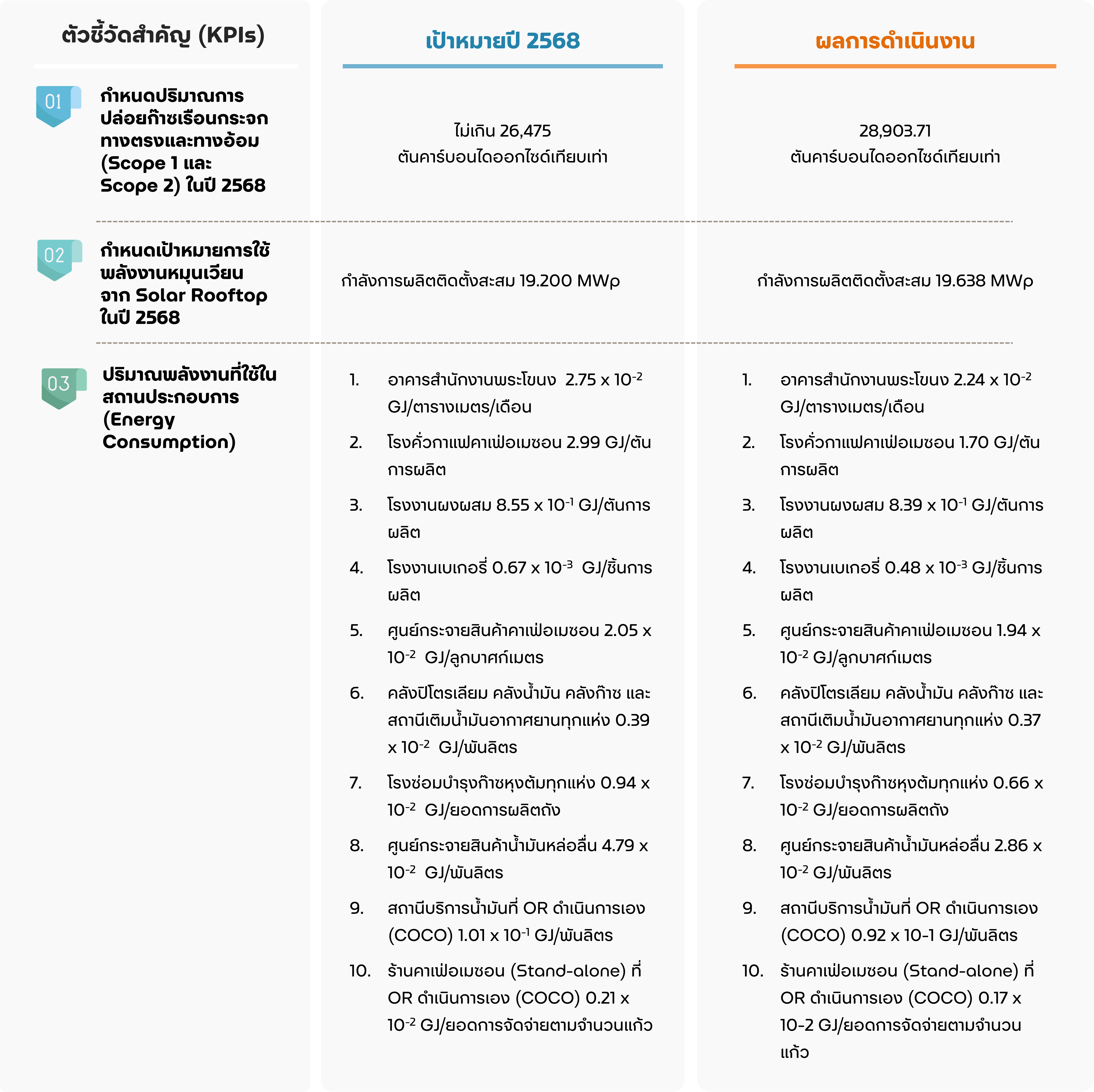 ทั้งนี้ OR มีการกำหนดตัวชี้วัดผลการดำเนินงาน (KPI) ด้านการเปลี่ยนแปลงสภาพภูมิอากาศและผนวกเข้ากับตัวชี้วัดผลการดำเนินงานขององค์กร (Corporate KPI) และมีการติดตาม วิเคราะห์เพื่อปรับปรุงและรายงานผลต่อกลุ่ม ปตท. อย่างต่อเนื่อง