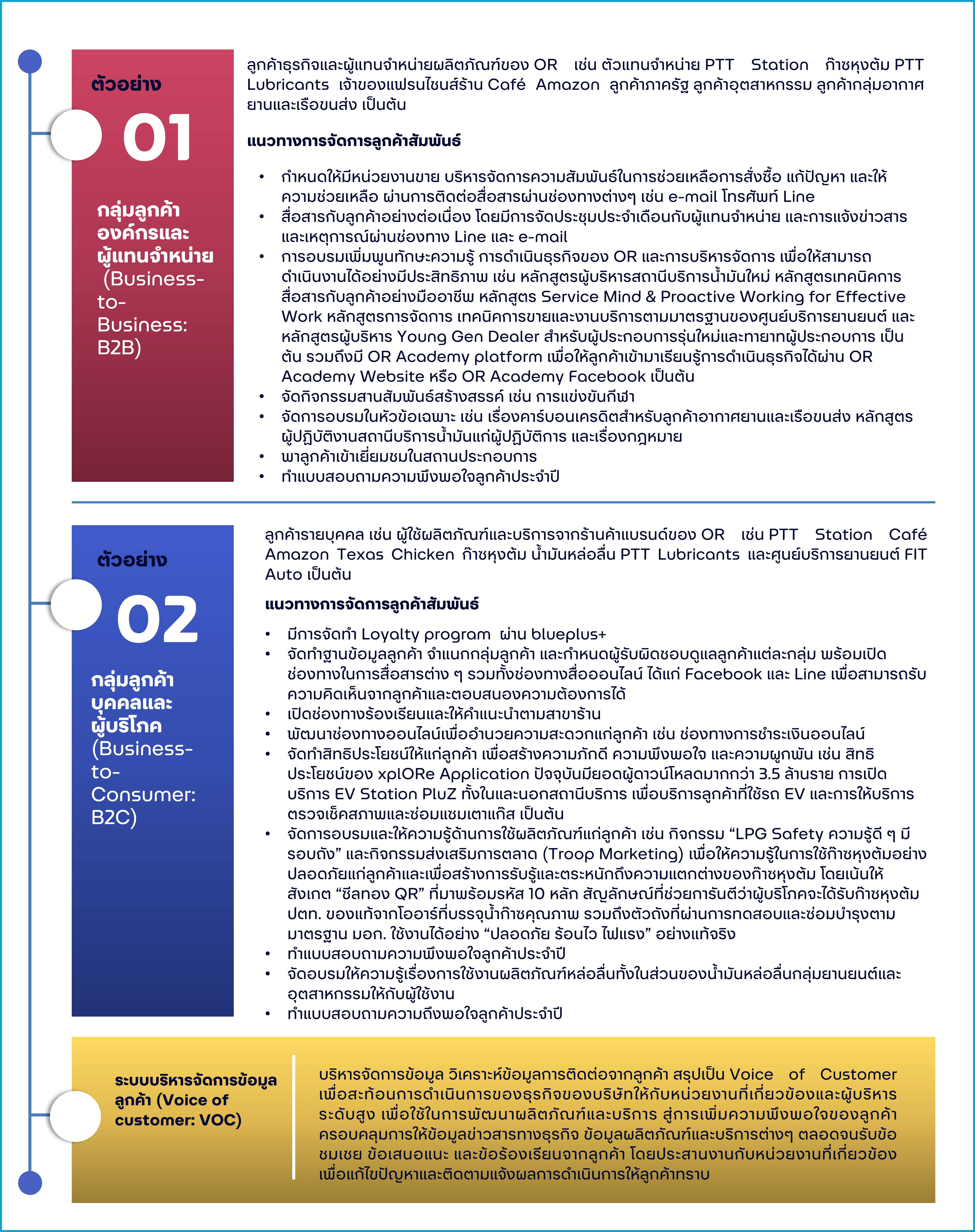 เนื่องจากธุรกิจของ OR มีลูกค้ารายองค์กร รวมถึงรายบุคคล จึงกำหนดแนวทางการบริหารจัดการลูกค้าสัมพันธ์แยกตามหน่วยธุรกิจ ดังนี้