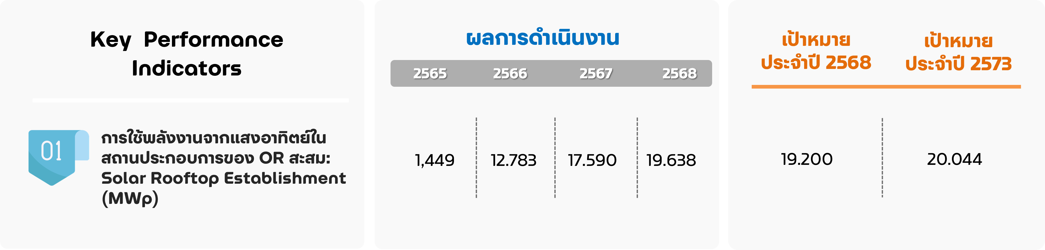 นอกจากการติดตั้ง Solar Rooftop ภายในสถานประกอบการของ OR เพื่อเพิ่มสัดส่วนการใช้พลังงานหมุนเวียนแล้ว OR ยังสนับสนุนและส่งเสริมให้คู่ค้า (Dealer) ของ PTT Station รวมถึงลูกค้ากลุ่มอุตสาหกรรมต่าง ๆ ติดตั้ง Solar Rooftop เพื่อลดการใช้ไฟฟ้าที่ผลิตจากเชื้อเพลิงแบบดั้งเดิมไปสู่การใช้พลังงานหมุนเวียน ซึ่งเป็นการช่วยลดปริมาณก๊าซเรือนกระจกใน Scope 3 อีกด้วย โดยปัจจุบันมีผลการดำเนินงาน ดังนี้