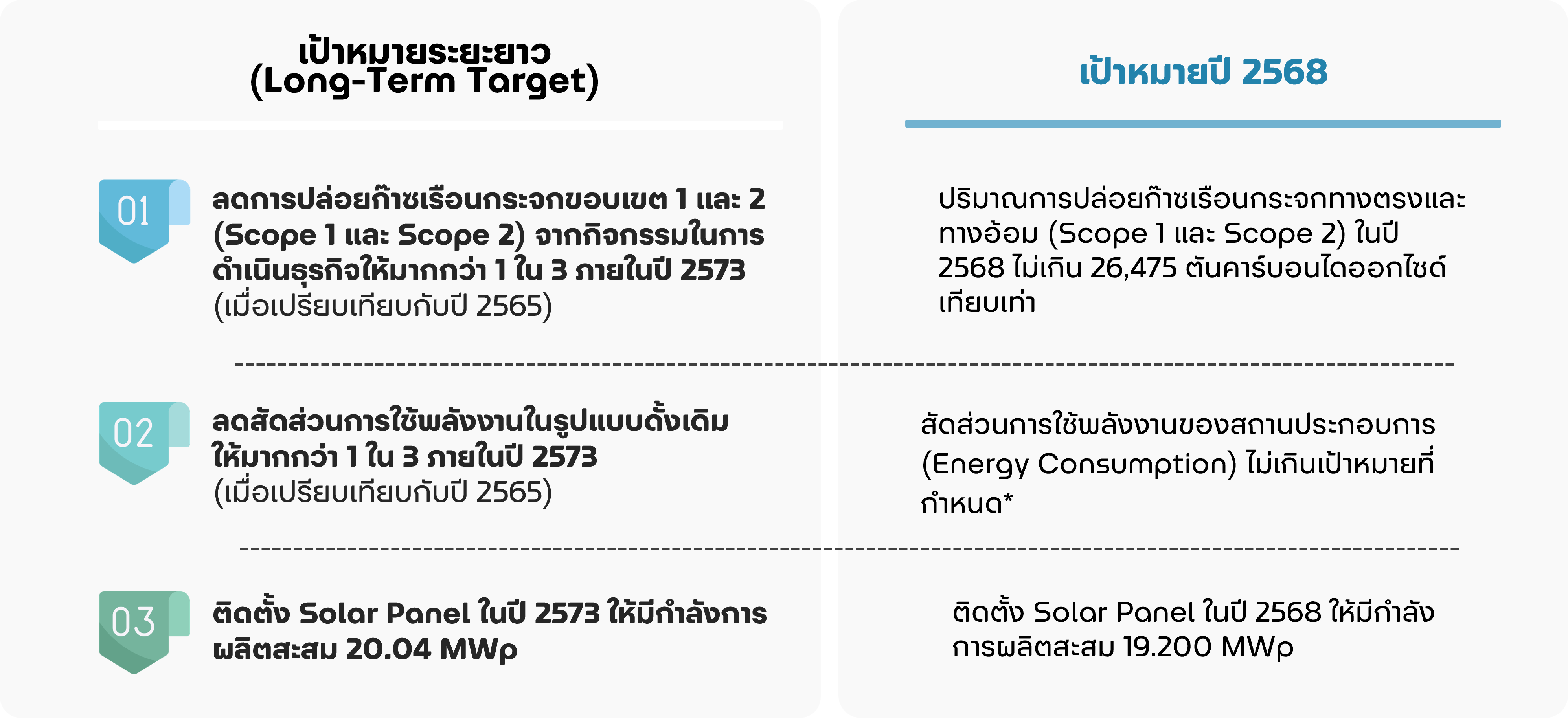 แนวทางของ Task Force on Climate-related Financial Disclosure (TCFD) และเพื่อทำความเข้าใจถึงความเสี่ยงจากการเปลี่ยนแปลงสภาพภูมิอากาศ ทั้งทางกายภาพ (Physical Risk) และความเสี่ยงระหว่างช่วงเปลี่ยนผ่าน (Transition Risk) ไปสู่สังคมคาร์บอนต่ำ เพื่อเดินหน้าสู่เป้าหมายการปล่อยก๊าซเรือนกระจกสุทธิเป็นศูนย์ (Net Zero Emissions) โดยอ้างอิงแนวทางตามหลักการกำหนดเป้าหมายทางวิทยาศาสตร์หรือ Science-Based Target (SBT)