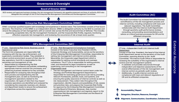 OR กำหนดและเน้นย้ำให้พนักงานทุกคนยึดหลักแนวทางการดำเนินงานที่คำนึงถึง Governance, Risk, และ Compliance (GRC) มีการเผยแพร่คู่มือบริหารความเสี่ยงทั่วทั้งองค์กรทางเว็บไซต์ที่พนักงานทุกคนเข้าถึงได้ ตลอดจนมีการจัดการฝึกอบรมระหว่างปี เพื่อให้พนักงานตระหนักถึงความสำคัญของกระบวนการบริหารความเสี่ยงและการควบคุมภายใน และเป็นการเพิ่มพูนความรู้ ความเข้าใจในด้านการบริหารความเสี่ยงและการควบคุมภายในให้กับผู้บริหารและพนักงานเพื่อนำไปปรับใช้ในการปฏิบัติงานได้อย่างมีประสิทธิภาพ