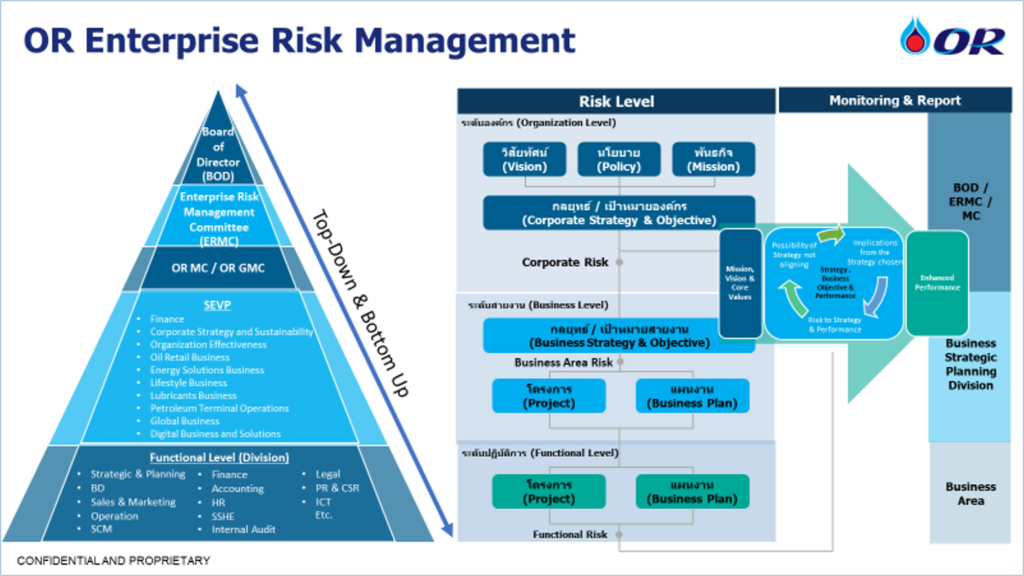 OR ได้ประกาศนโยบายการบริหารความเสี่ยง ซึ่งกำหนดกรอบและกระบวนการบริหารความเสี่ยงที่เชื่อมโยงกันทุกระดับในองค์กร ตามหลักเกณฑ์ของ COSO Enterprise Risk Management – Integrated Framework 2017 ซึ่งขับเคลื่อนโดยทีมบริหารความเสี่ยงและควบคุมภายใน สังกัดฝ่ายกลยุทธ์และการบริหารการลงทุน โดยมีการเชื่อมโยงการบริหารความเสี่ยงกับกระบวนการทำกลยุทธ์และแผนธุรกิจตั้งแต่เริ่มต้นกระบวนการ ให้มีความเชื่อมโยงกันในทุกระดับตลอดทั้งห่วงโซ่คุณค่า มีการติดตามความคืบหน้าการบริหารจัดการความเสี่ยงรายไตรมาสและรายปีเพื่อรายงานต่อคณะกรรมการบริหารความเสี่ยงองค์กรและคณะกรรมการบริษัท เพื่อทบทวนประเด็นความเสี่ยงอย่างสม่ำเสมอ และควบคุมความเสี่ยงขององค์กรให้อยู่ในระดับที่ OR สามารถยอมรับได้