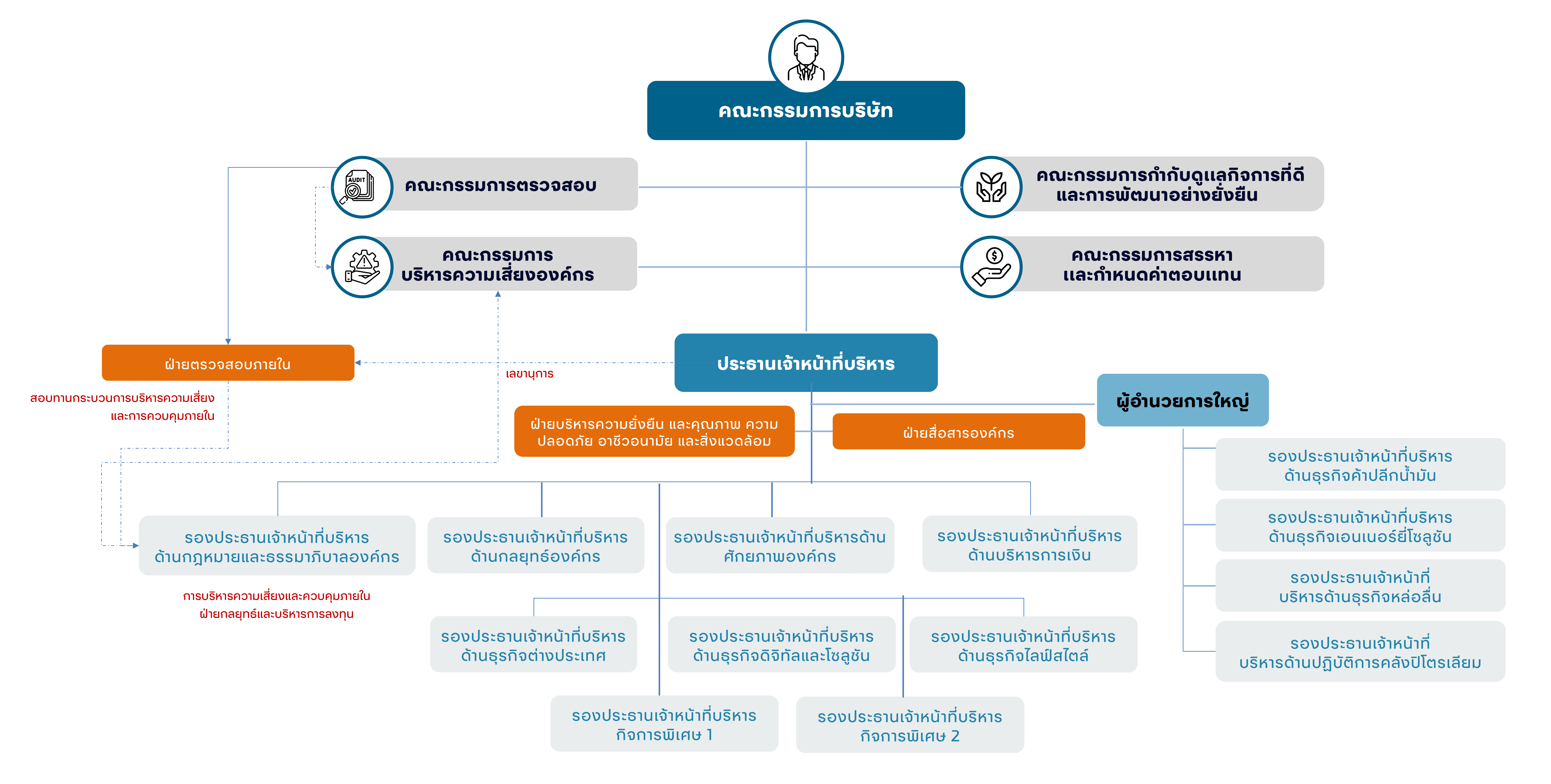 การดำเนินธุรกิจในปัจจุบันมีความท้าทายที่มากขึ้น ทั้งในภาพของการแข่งขันในตลาด วิกฤตการณ์และการเปลี่ยนผ่านการบริหารความเสี่ยง (Risk Management) จึงถือเป็นเครื่องมือสำคัญสำหรับการบริหารจัดการธุรกิจของ OR เพื่อสร้างความเชื่อมั่นว่าการดำเนินธุรกิจสามารถบรรลุเป้าหมาย ตอบสนองต่อความต้องการของผู้มีส่วนได้เสียทุกกลุ่มอย่างสมดุล และป้องกันความสูญเสียที่อาจเกิดขึ้นจากความไม่แน่นอน พร้อมทั้งแสวงหาโอกาสในการเพิ่มมูลค่าทางธุรกิจเพื่อรักษาศักยภาพในการแข่งขันขององค์กรต่อไปในอนาคต OR จึงจัดตั้งโครงสร้างการบริหารจัดการความเสี่ยง ซึ่งกำกับดูแลโดยคณะกรรมการบริหารความเสี่ยงองค์กร โดยมีคณะกรรมการตรวจสอบเป็นผู้สอบทานระบบการบริหารความเสี่ยง และช่วยผลักดันให้เกิดการบริหารความเสี่ยงอย่างมีประสิทธิภาพทั่วทั้งองค์กร