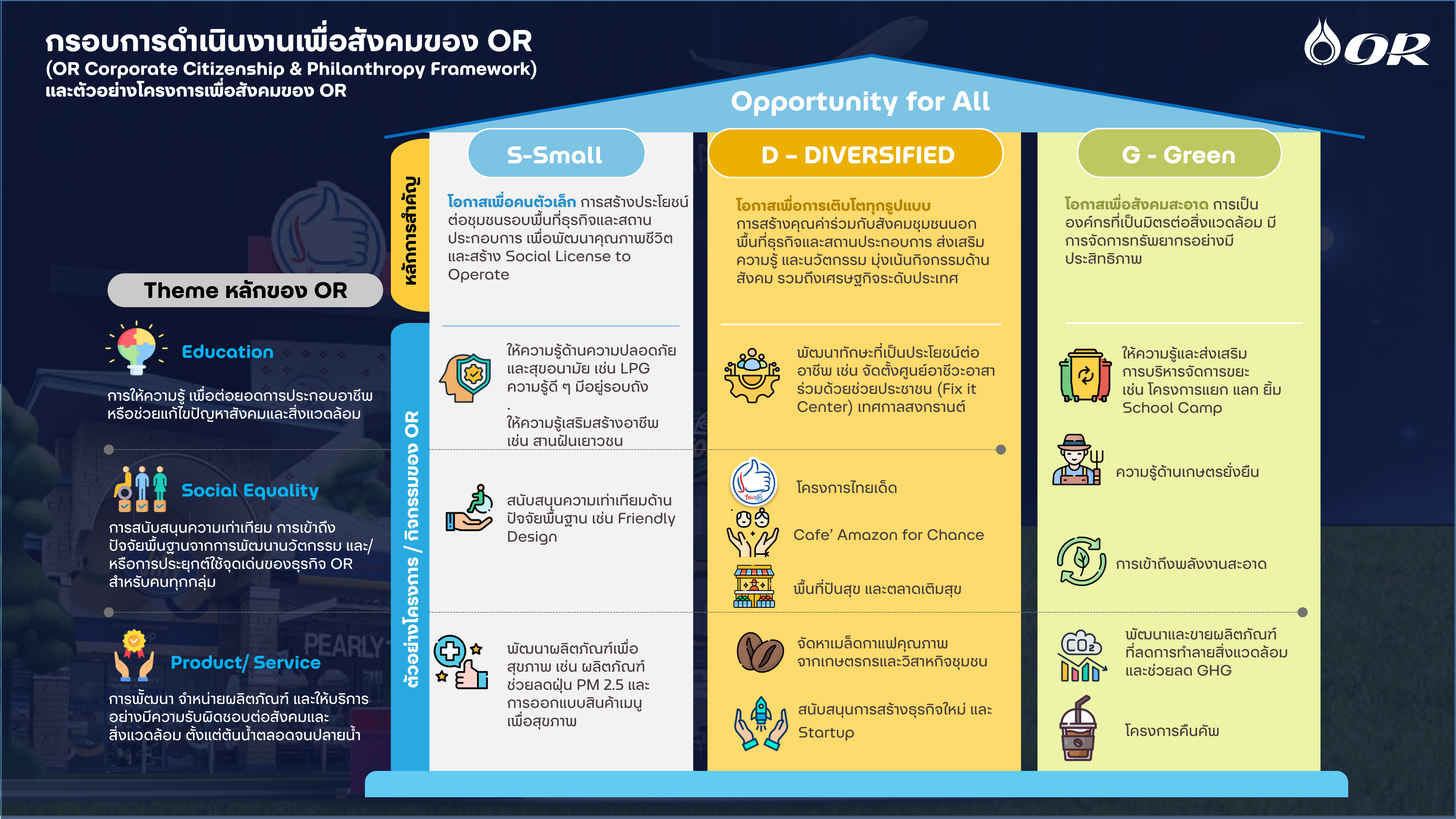 การดำเนินงานด้านความรับผิดชอบต่อสังคมช่วยส่งเสริมการบรรลุเป้าหมายที่ยั่งยืนของบริษัทฯ “OR 2030 Goals” ที่การคำนึงถึงสามเสาหลักของการดำเนินงานด้านยั่งยืน ได้แก่ S-Small โอกาสเพื่อคนตัวเล็ก D-Diversified โอกาสเพื่อการเติบโตทุกรูปแบบ G-Green โอกาสเพื่อสังคมสะอาด และสอดคล้องกับเป้าหมายการพัฒนาที่ยั่งยืนขององค์การสหประชาชาติ (SDGs) สำหรับการดำเนินงานภายใต้กรอบการดำเนินงานด้านความรับผิดชอบต่อสังคม ทั้งนี้ OR จัดกลุ่มการดำเนินโครงการและกิจกรรมความรับผิดชอบต่อสังคมตามวัตถุประสงค์และลักษณะการจัดการประเด็นทางสังคมและสิ่งแวดล้อมออกเป็น 3 ด้านหลัก รวมถึงกำหนดตัวชี้วัดเพื่อวัดผลการดำเนินงานต่าง ๆ รายละเอียดดังนี้