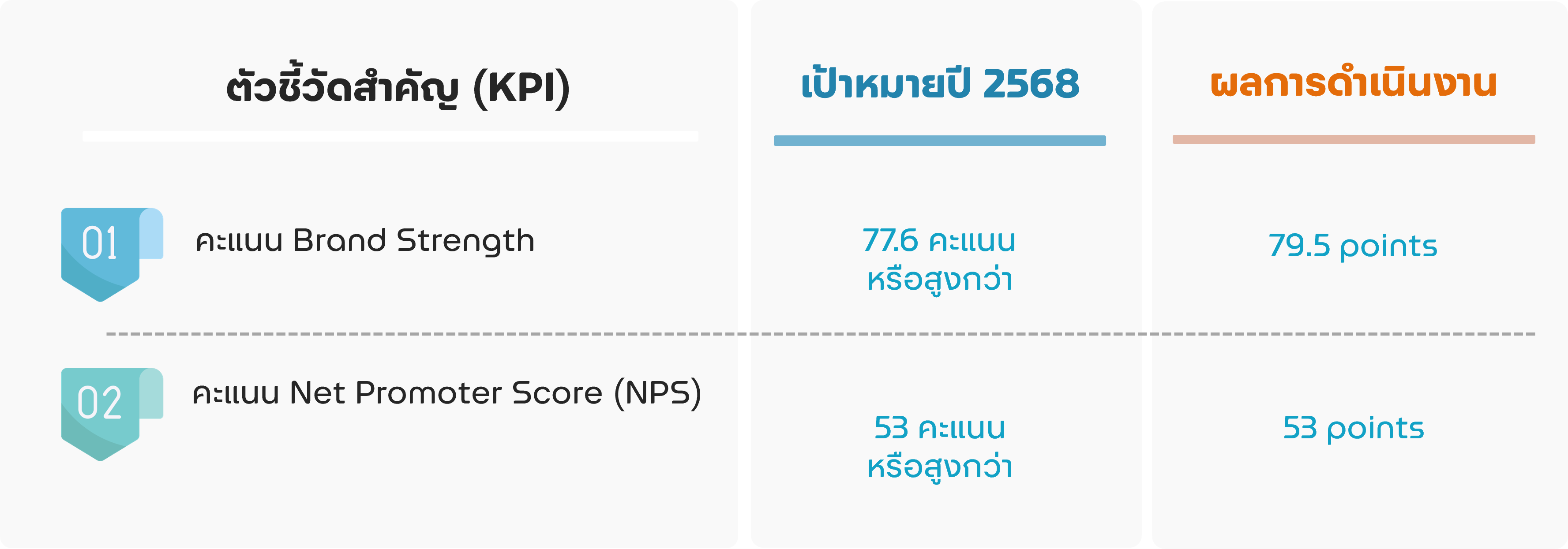 ทั้งนี้ คะแนนทั้ง 3 ด้าน ในภาพรวมสูงกว่าเป้าหมายที่ตั้งไว้ในปี 2567 ซึ่งเท่ากับ 77.6 คะแนน อยู่ที่ 1.9 คะแนน สำหรับผลการประเมิน Net Promoter Score (NPS) หรือเครื่องมือสำหรับวัดการยินดีบอกต่อสินค้าและบริการของลูกค้า เท่ากับ 53 คะแนน เท่ากับค่าเป้าหมายที่กำหนดไว้ในปี 2567 ซึ่งเท่ากับ 53 คะแนน