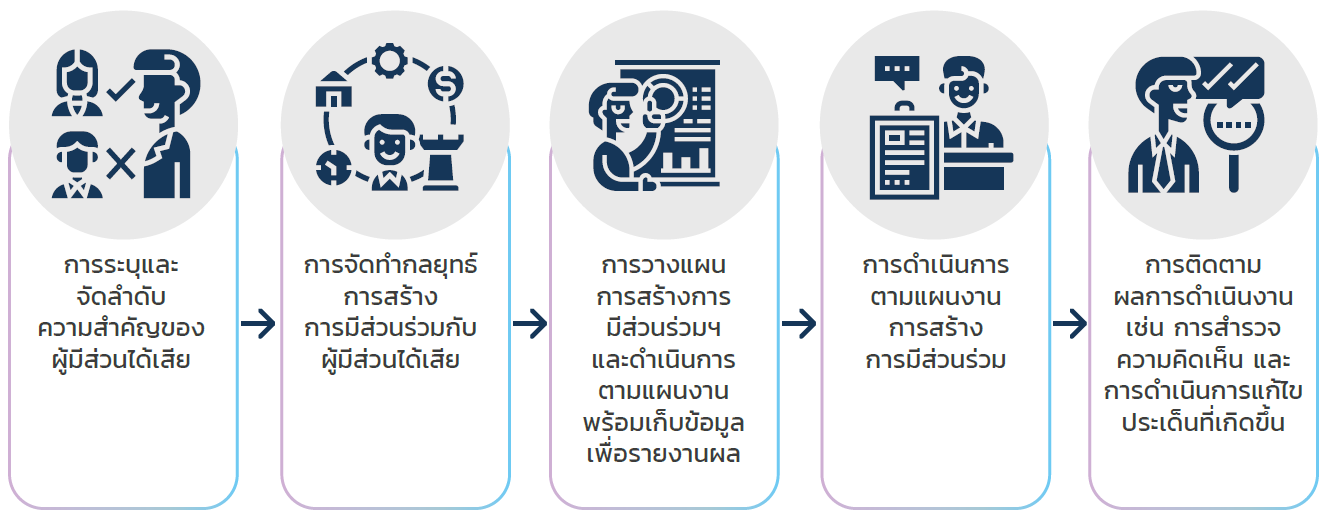 OR สร้างความผูกพันกับผู้มีส่วนได้เสียแต่ละกลุ่มแตกต่างกันไปตามความเหมาะสมของโอกาสและระดับของความสัมพันธ์ ทั้งในรูปแบบทางการและไม่เป็นทางการ เพื่อร่วมกันผลักดันให้เกิดการเปลี่ยนแปลงเชิงบวก และลดผลกระทบเชิงลบที่อาจเกิดขึ้นสำหรับทุกฝ่าย โดยกำหนดแนวทางสร้างการมีส่วนร่วมกับผู้มีส่วนได้เสีย ซึ่งประกอบด้วย