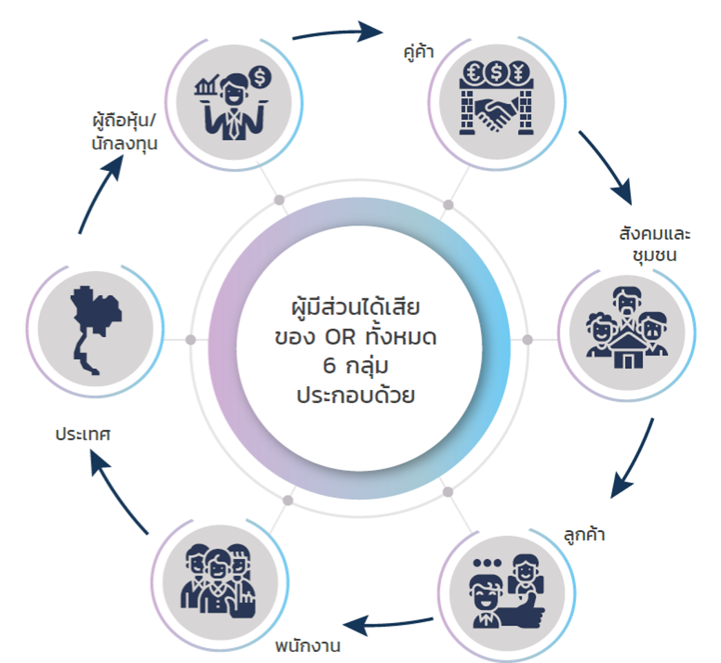 จากกรอบนโยบายการบริหารจัดการความยั่งยืน ที่มุ่งเน้นการรักษาสมดุลด้านเศรษฐกิจ สังคม และสิ่งแวดล้อม รวมถึงผู้มีส่วนได้เสียทุกกลุ่ม OR จึงพัฒนาคู่มือปฏิบัติการบริหารจัดการผู้มีส่วนได้เสีย (Stakeholder Engagement Guideline) และได้กำหนดแนวทางการสร้างการมีส่วนร่วมกับผู้มีส่วนได้เสียที่มีประสิทธิภาพ และโดยอ้างอิงจากมาตรฐาน AA1000 Stakeholder Engagement Standard ของ Accountability ซึ่งแต่ละหน่วยงานมีหน้าที่ในการระบุและจัดลำดับความสำคัญของผู้มีส่วนได้เสียที่เกี่ยวข้องกับหน่วยงานของตนเอง และดำเนินการสร้างการมีส่วนร่วมกับผู้มีส่วนได้เสีย ซึ่งจะแตกต่างกันออกไปตามการจัดลำดับความสำคัญและประเด็นข้อกังวล/ความคาดหวังของกลุ่มผู้มีส่วนได้เสีย และรวบรวมข้อมูลการดำเนินงานให้แก่ฝ่ายบริหารความยั่งยืน และคุณภาพ ความปลอดภัย อาชีวอนามัย และสิ่งแวดล้อม โดยสามารถสรุปผลการดำเนินงานได้ดังต่อไปนี้